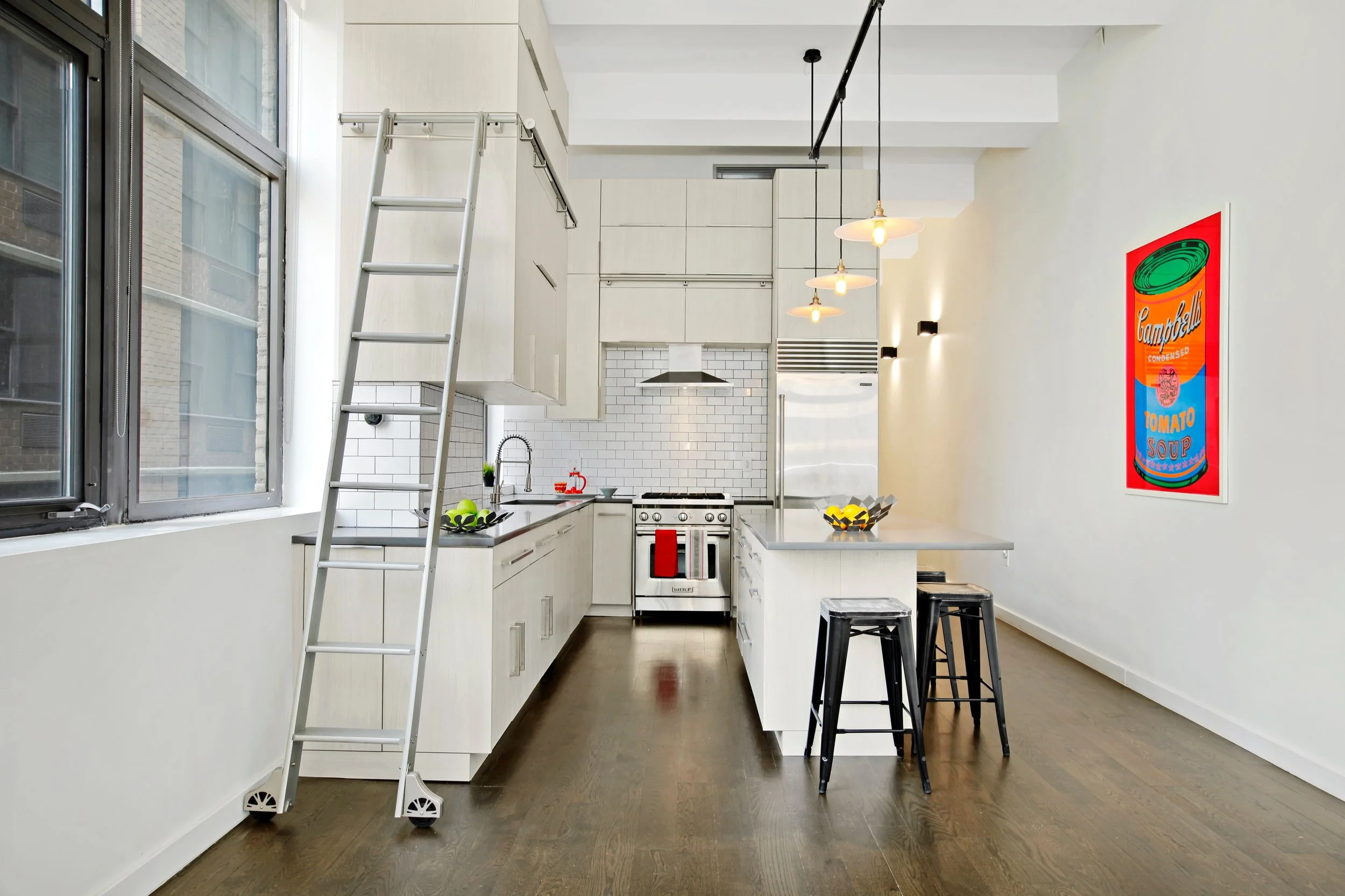 This incredibly long and thin galley style apartment features various wood tones, stone, and soft pastels giving an air of warmth throughout. The bedroom and bathroom are tucked away near the entrance and shelves scale up to the 13’ high ceilings throughout giving precious floor space back to an already lofty kitchen and living room.