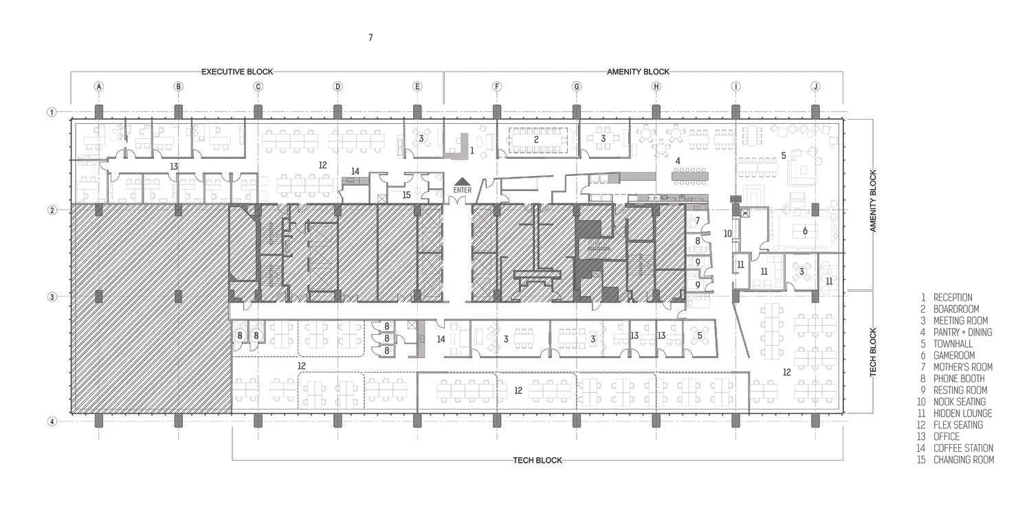 Office floor plan with labeled areas: reception, boardroom, meeting rooms, pantry and dining, townhall, gameroom, mother's room, phone booth, resting room, nook seating, hidden lounge, flex seating, offices, coffee station, changing room. Sections in