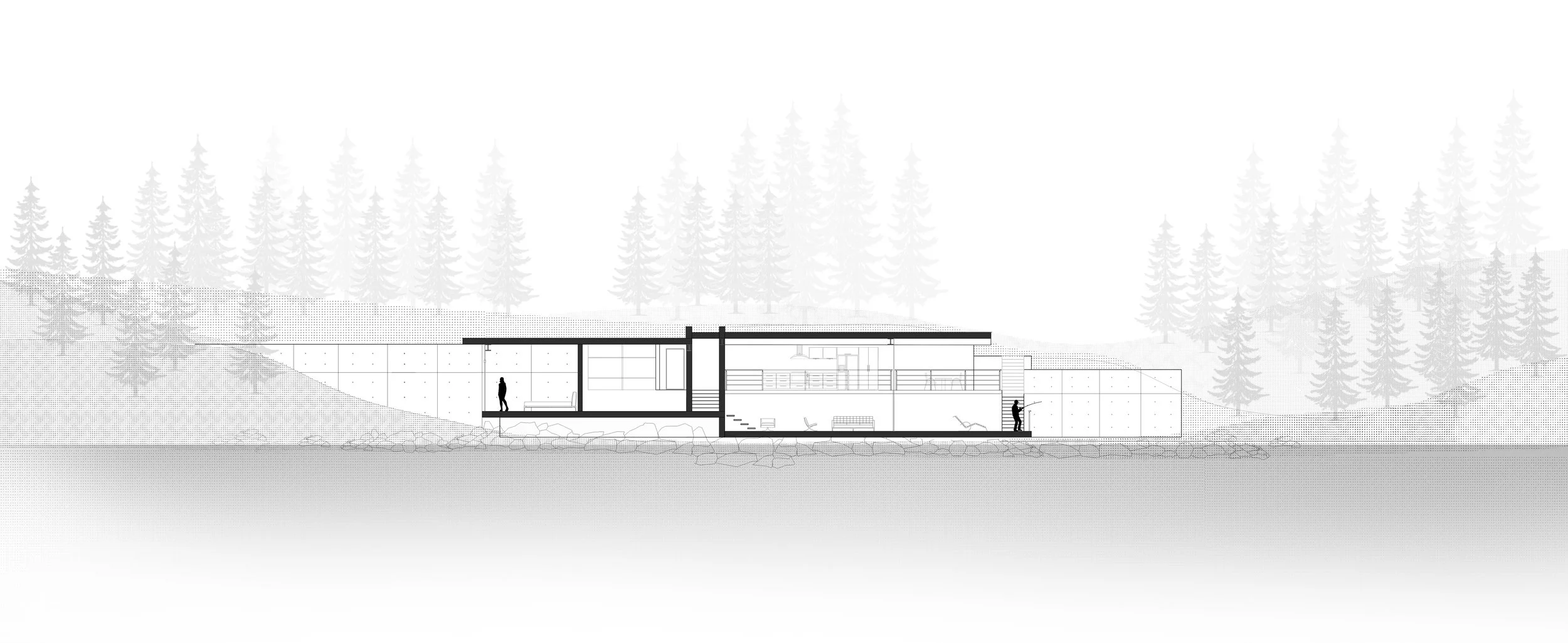 The low-lying residence is a stony outcropping absorbed into the riverside becoming a feature within the landscape rather than the focal point. Undulating with the hillside, the interior becomes its own topography that peers onto the forest’s edge.