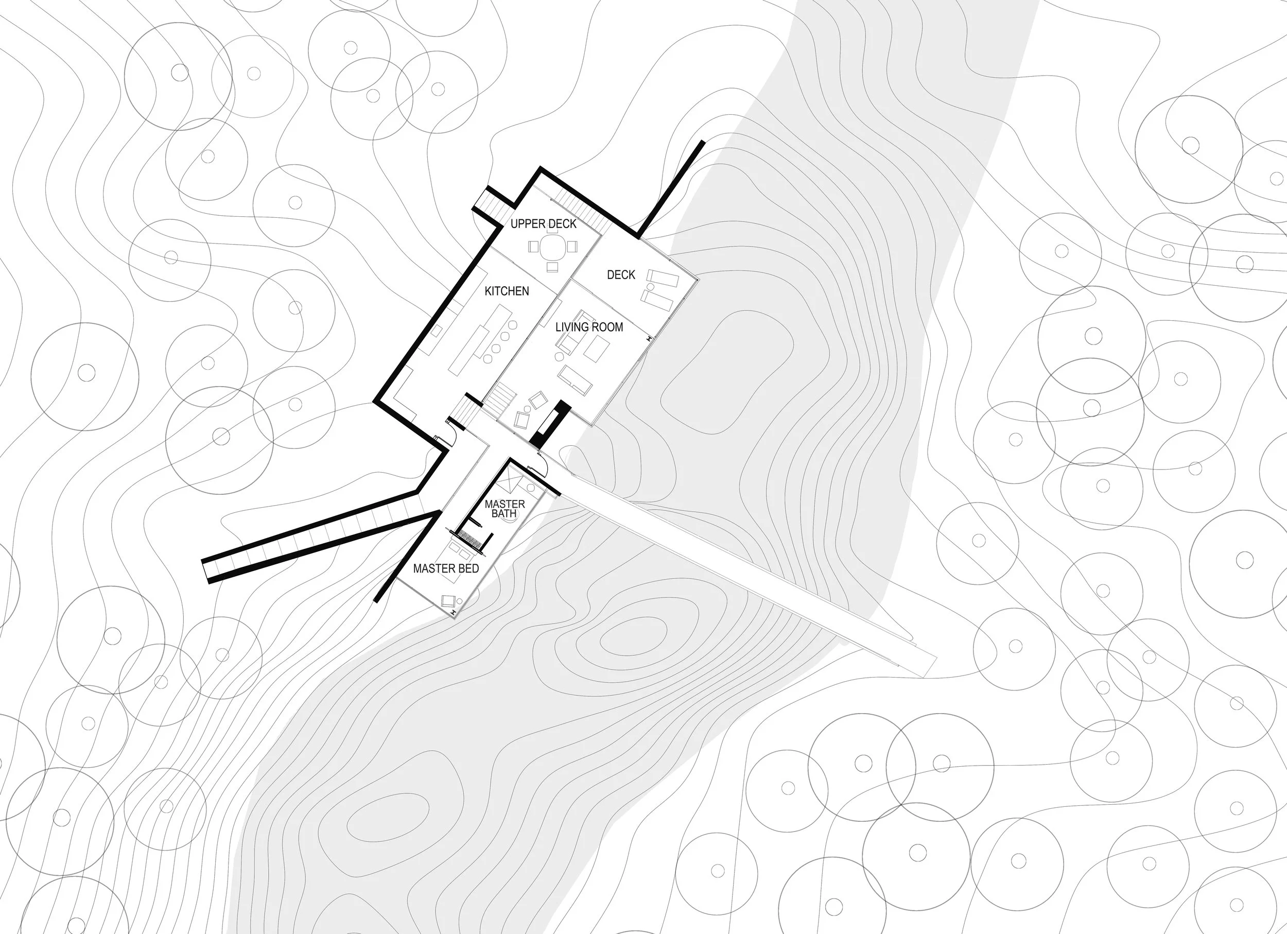 The approach is an extended threshold created by a loose path that weaves through the scattered trees. This path leads into a modestly carved concrete stair which amplifies the feeling of emerging from the topography. The stepping of the interior matches the pre-existing topography and the kitchen overlooks the double height living space floating just above the river. Next to the flow of the river is a foot bridge extending into the trees beyond, acting as the central spine to the home.