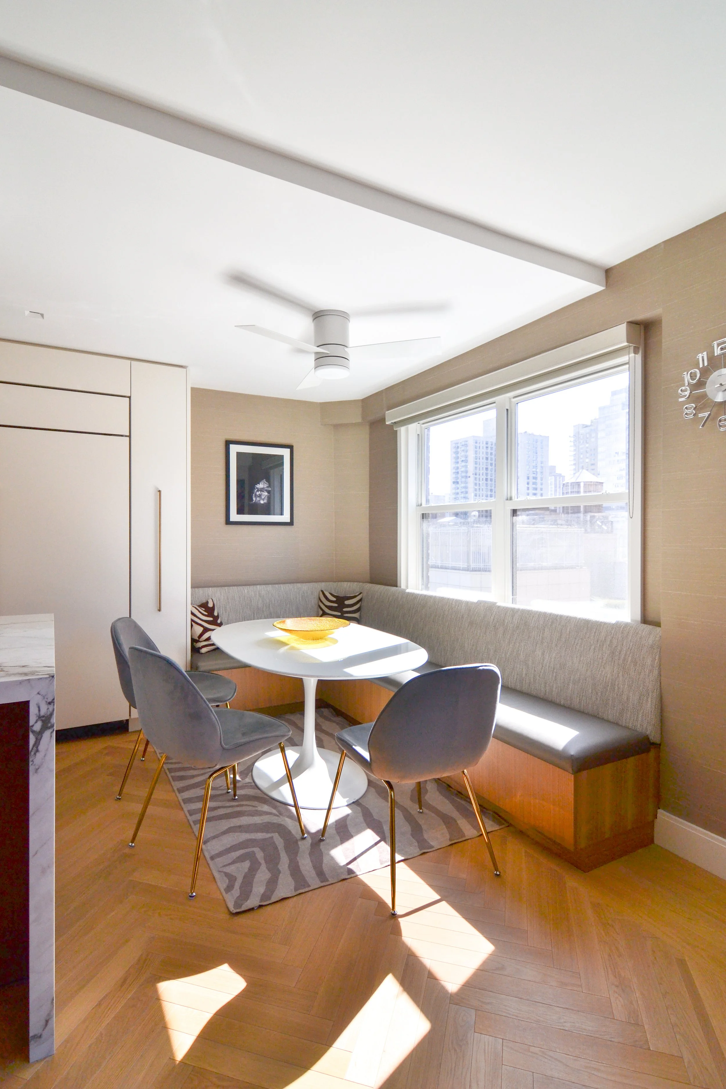 Bleached walnut cabinets, oak herringbone flooring, and aged brass carry throughout the residence. This carries the air of nostalgia with a touch of modern detailing.
