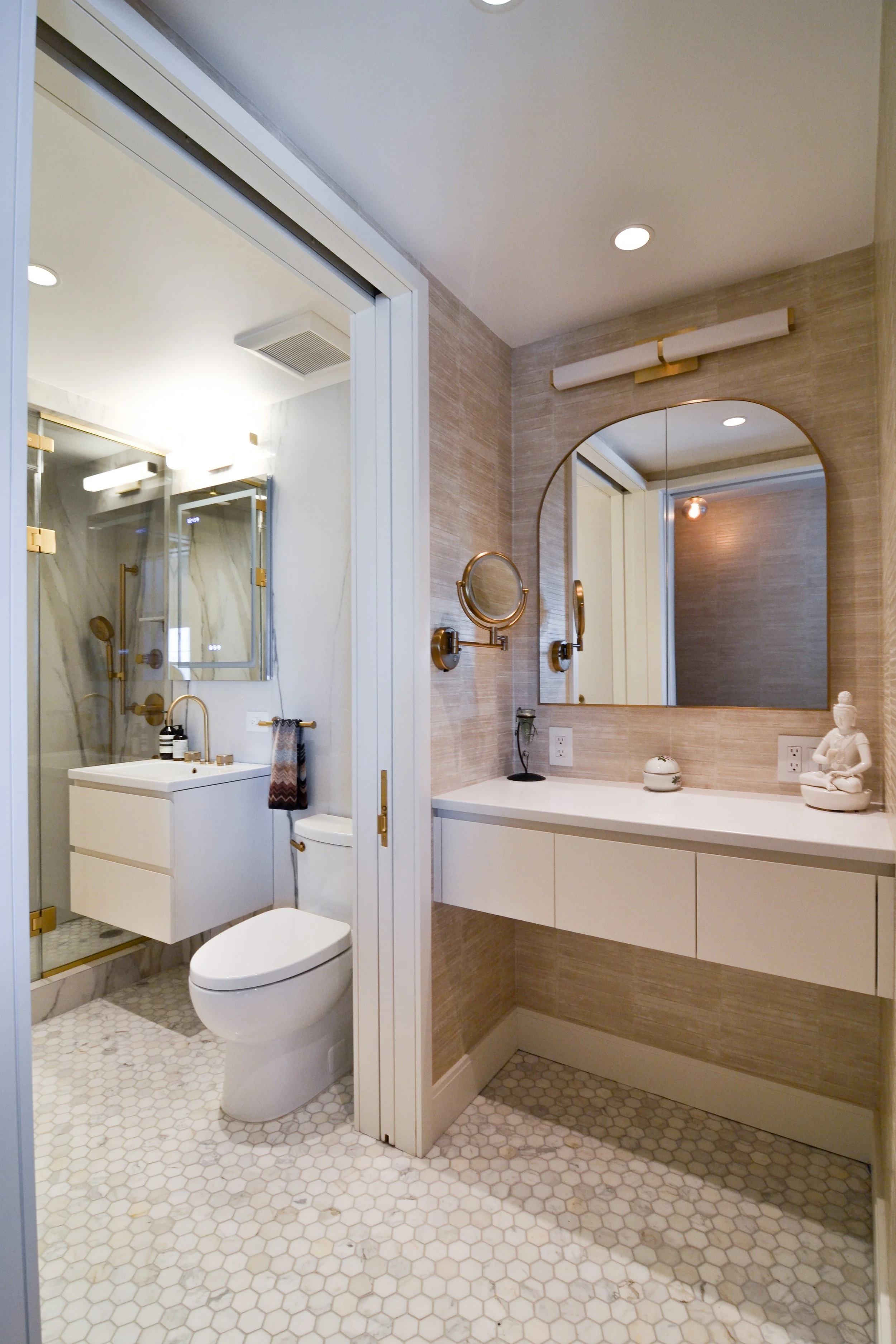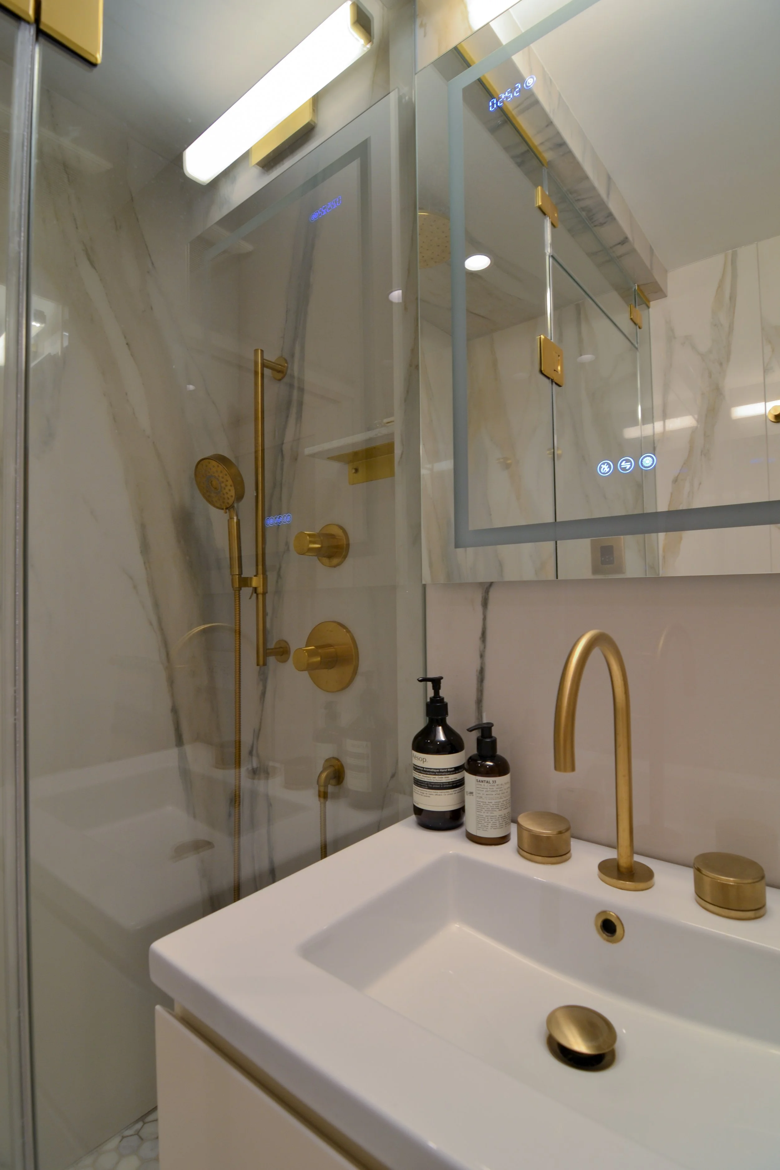 Brass vanities capture the tones of Carrara Gold marble walls and tiles throughout the suite.